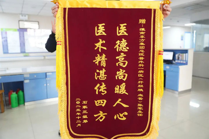 近日,淮南東方醫(yī)院集團總醫(yī)院普外科肝膽胰病區(qū)因優(yōu)質(zhì)服務(wù)、技術(shù)精湛再次受到患者及家屬的贊譽,一面寫有“醫(yī)德高尚暖人心,醫(yī)術(shù)精湛傳四方”的錦旗送到普外科張軍主任的手中。鮮艷火紅的錦旗,樸實無華的謝語,表達了患者及家屬的感激之情,更讓人感受到的是醫(yī)患之間流露的真誠與和諧。