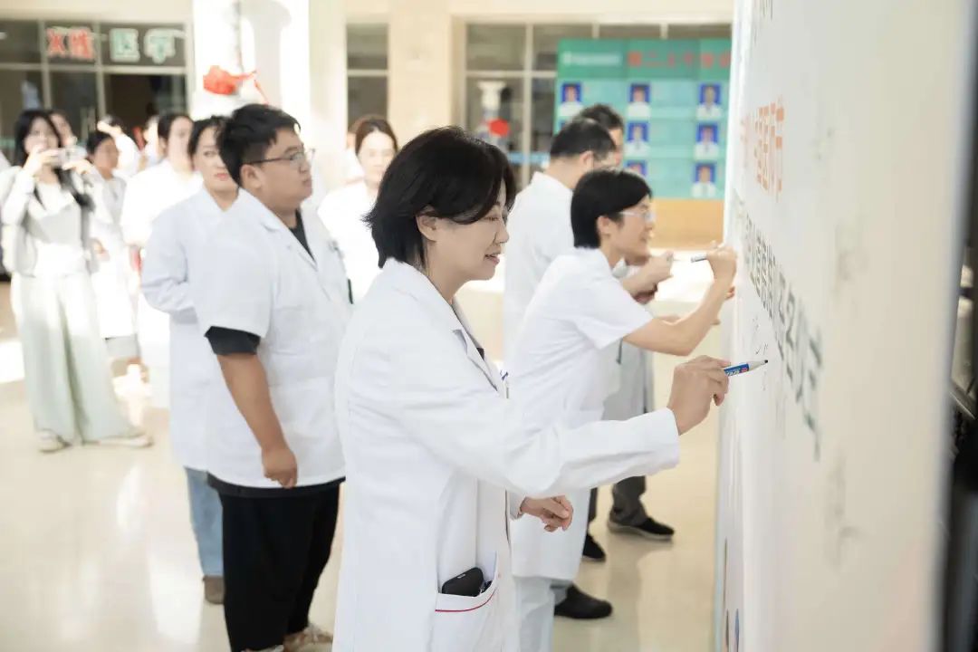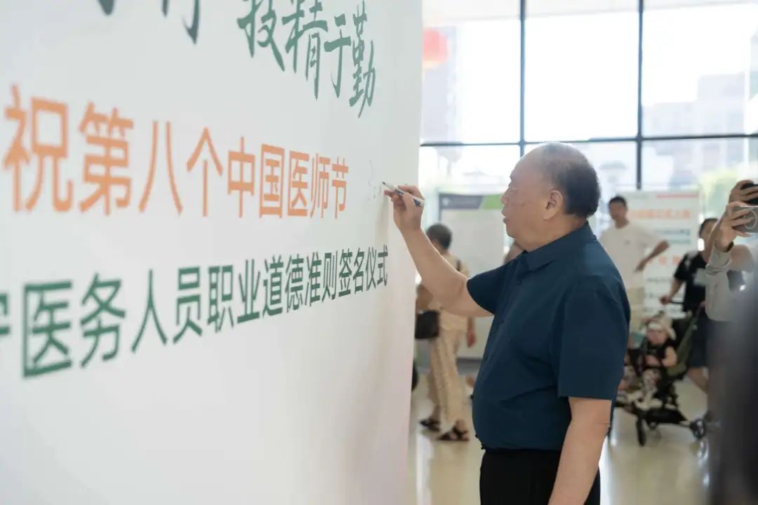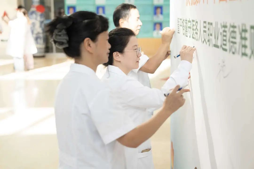 頒獎(jiǎng)儀式后,現(xiàn)場(chǎng)舉行了莊重的“嚴(yán)格遵守醫(yī)務(wù)人員職業(yè)道德準(zhǔn)則”簽名儀式。廣大醫(yī)師神情肅穆,以手為筆,以心為墨,在承諾墻上鄭重簽下自己的名字。這一筆一劃,凝聚著對(duì)職業(yè)信仰的堅(jiān)守,彰顯了東方總院醫(yī)師隊(duì)伍恪守醫(yī)德、廉潔行醫(yī)、全心全意為患者服務(wù)的堅(jiān)定決心。