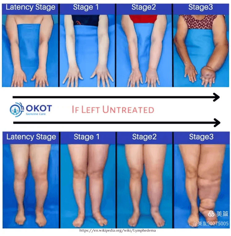 繼發(fā)性淋巴水腫多繼發(fā)于手術(shù)、淋巴結(jié)清掃、放射治療、感染、惡性腫瘤轉(zhuǎn)移等情況,主要與乳腺癌腋窩淋巴結(jié)清掃有關(guān)。手術(shù)后的患肢淋巴系統(tǒng)多數(shù)處在代償狀態(tài),肢體勞累、感染和損傷等因素造成已經(jīng)超負(fù)荷的淋巴系統(tǒng)失去代償功能,導(dǎo)致淋巴水腫。