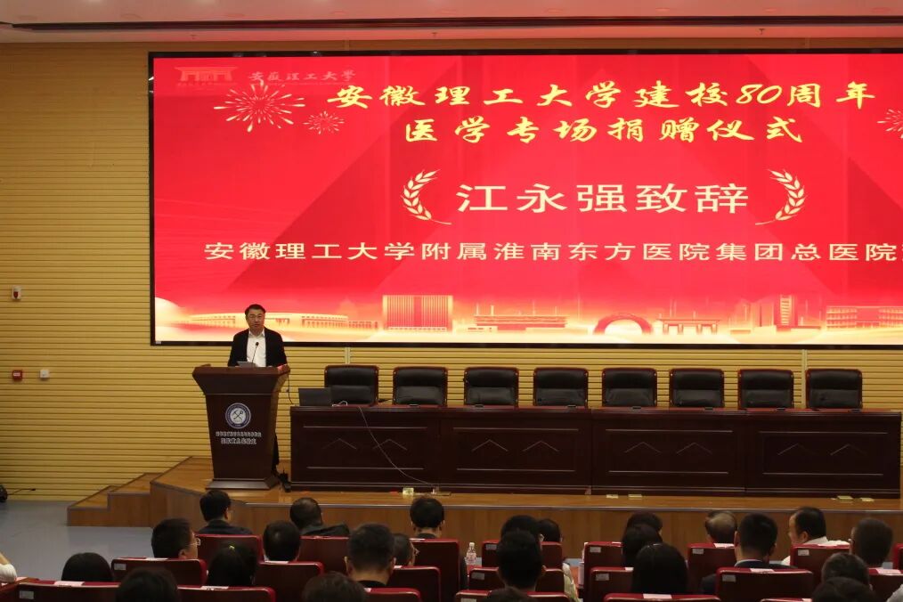 捐贈儀式上,江永強董事長發(fā)表了熱情洋溢的致辭。他回顧了東方醫(yī)院集團自2004年正式成為安徽理工大學附屬醫(yī)院以來,雙方長達二十一年的緊密合作歷程。他表示,安徽理工大學在醫(yī)、教、研等多方面給予了東方醫(yī)院全方位的支持與幫助,特別是在東方總院創(chuàng)建三甲過程中,學校傾力指導,為醫(yī)院的高質量發(fā)展奠定了堅實基礎。他深情地說道:“東方醫(yī)院的成長與進步,離不開學校這片沃土的培育?!?/p>