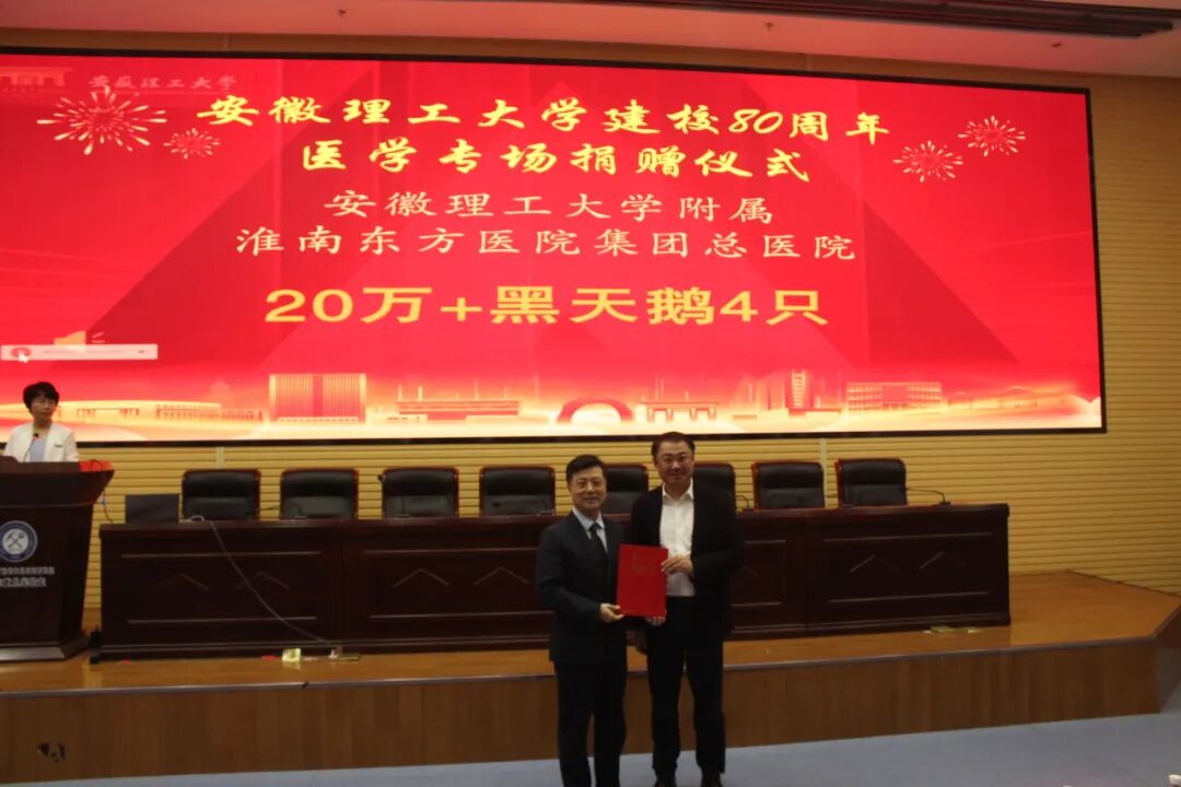 在安徽理工大學喜迎建校八十周年之際,9月29日,淮南東方醫(yī)院集團董事長江永強出席校慶捐贈儀式,并代表集團向學校捐贈人民幣20萬元及四只黑天鵝,以表達對學校八十華誕的誠摯祝賀與深厚情誼。
