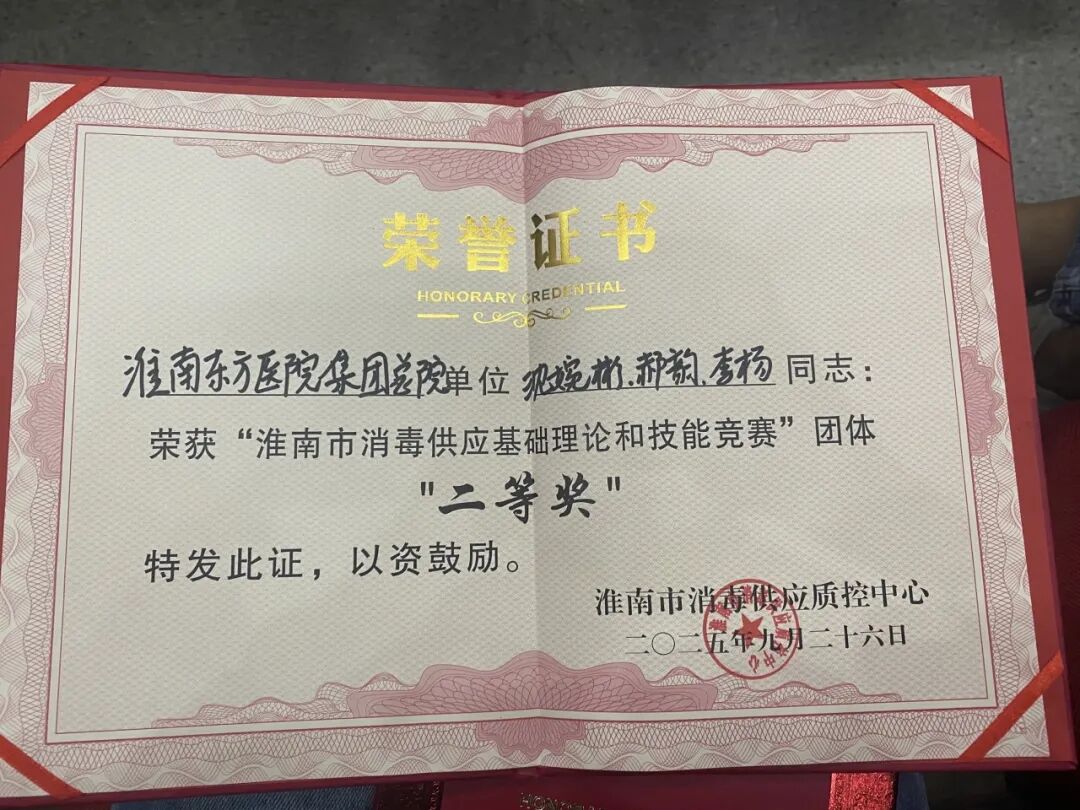 比賽中,淮南東方醫(yī)院集團總醫(yī)院選派沈婉彬、郝韻、李楊三位同志組隊參賽。她們在緊張的團隊理論考試中沉著應(yīng)對、配合默契,展現(xiàn)出深厚的專業(yè)理論素養(yǎng);在技能比武環(huán)節(jié),則憑借規(guī)范嫻熟的操作、嚴謹細致的流程,贏得了評委的高度認可。最終,團隊以總分優(yōu)異的成績榮獲團體二等獎。